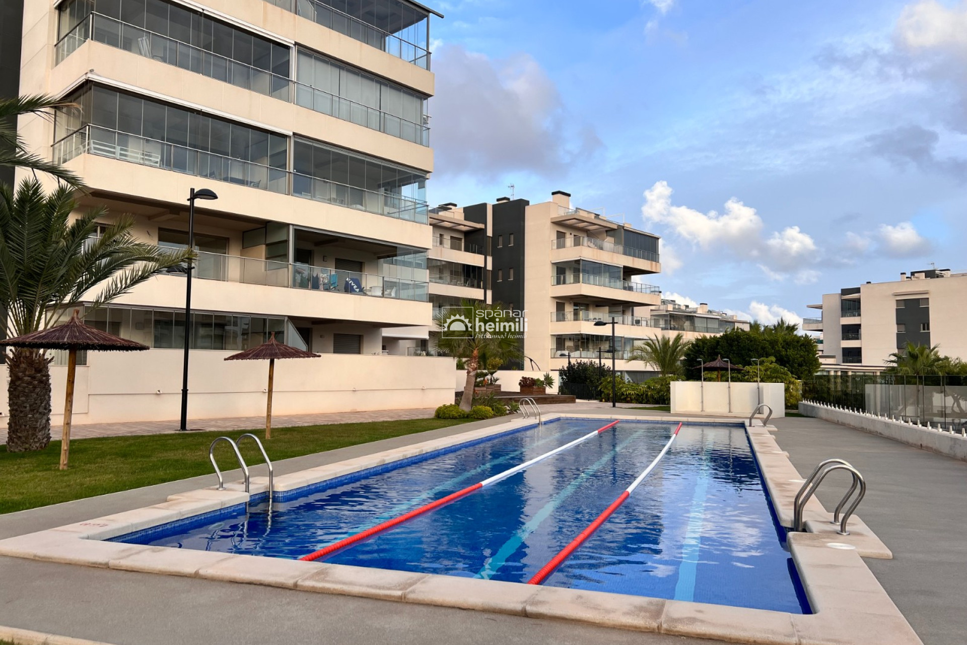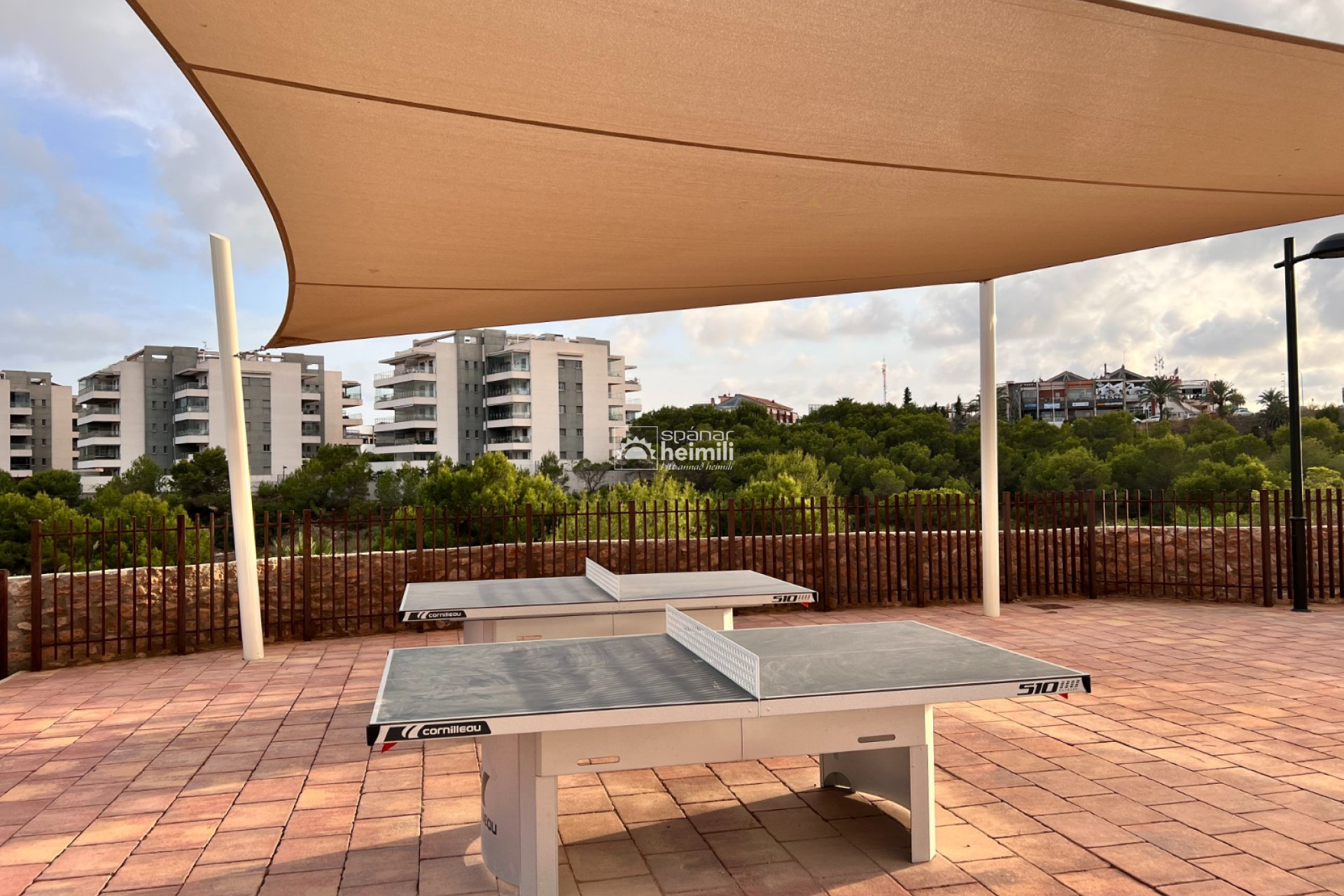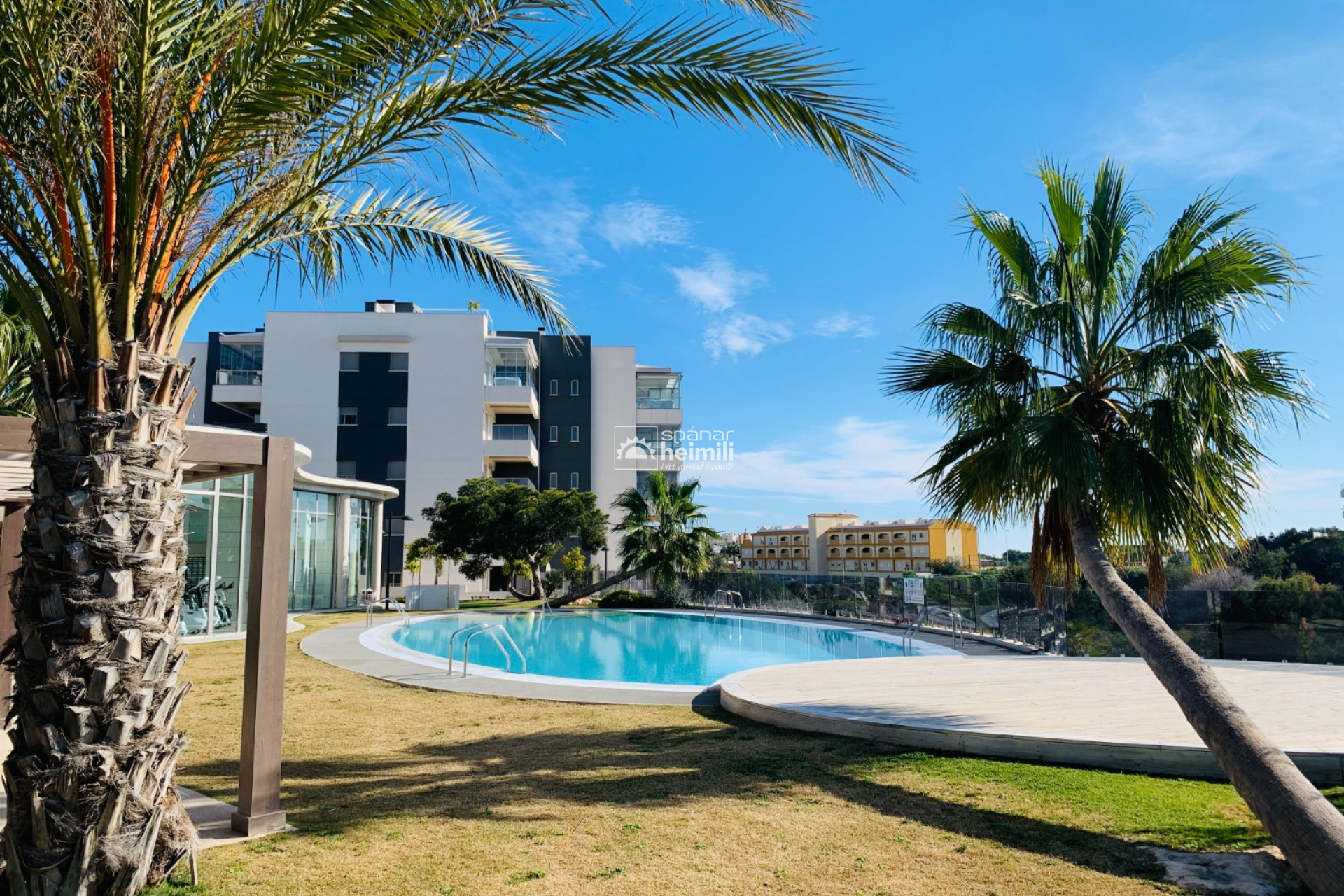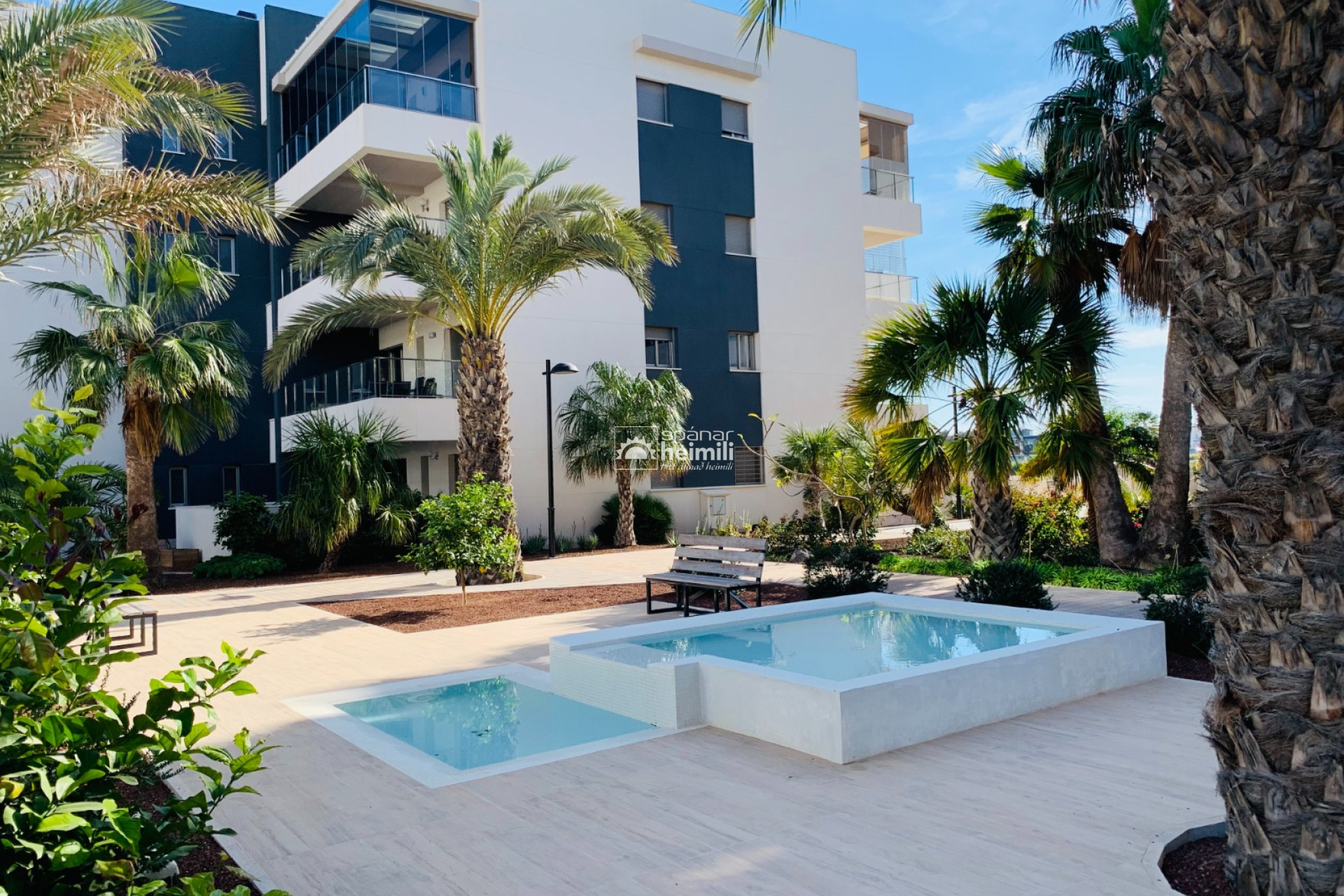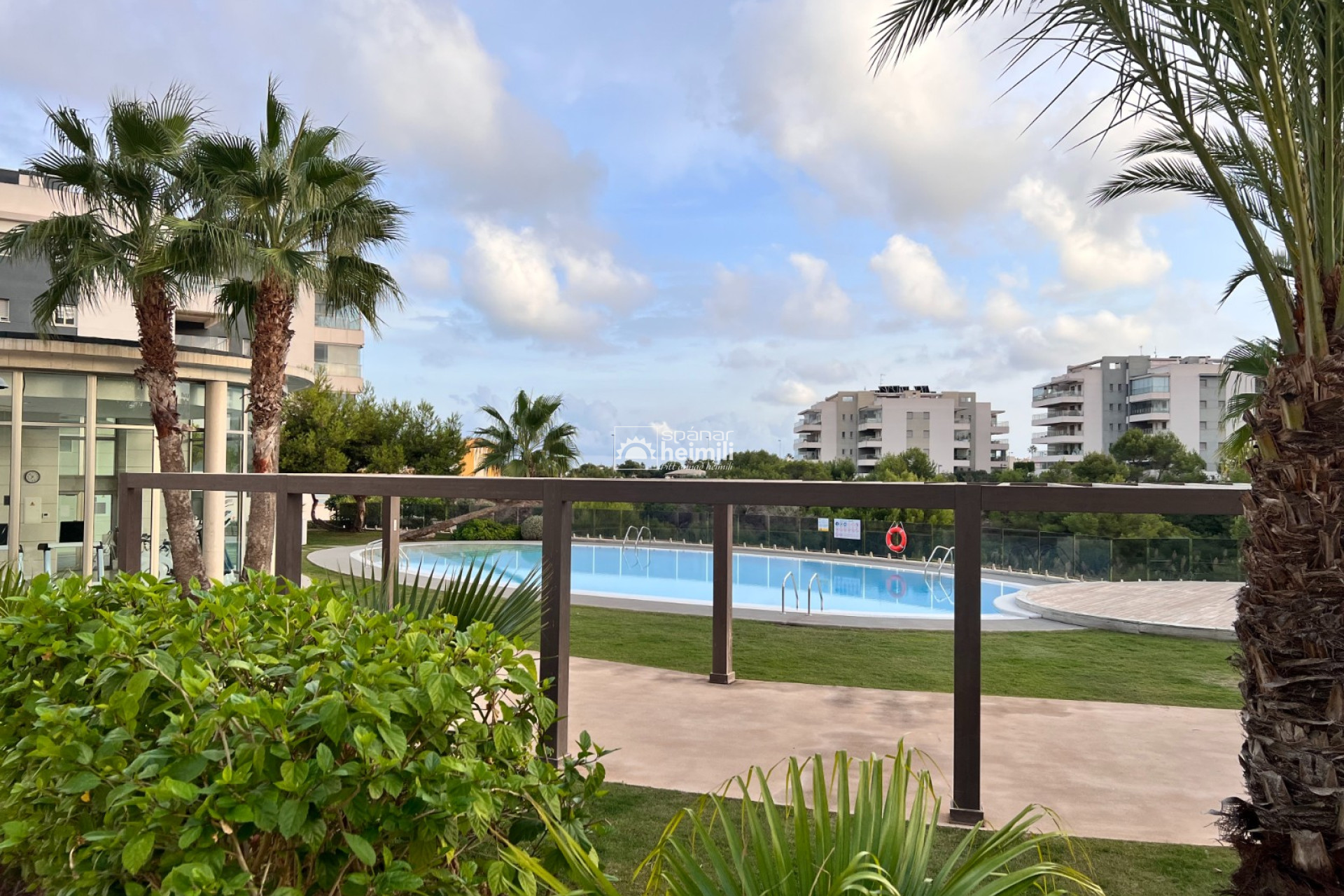 Það er fallegur sameiginlegum garði með frábærri aðstöðu, í garðinum er upphituð inni sundlaug, úti sundlaug, sauna og líkamsræktarsalur. Einnig fylgir einkabílastæði í bílastæðahúsi innan garðsins með fjarstýrðu hliði