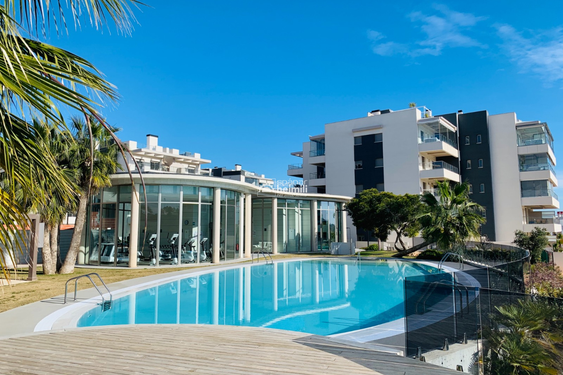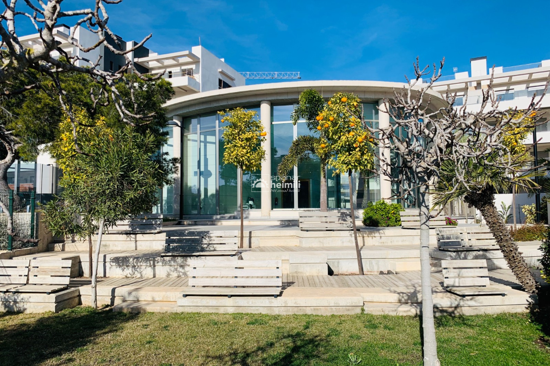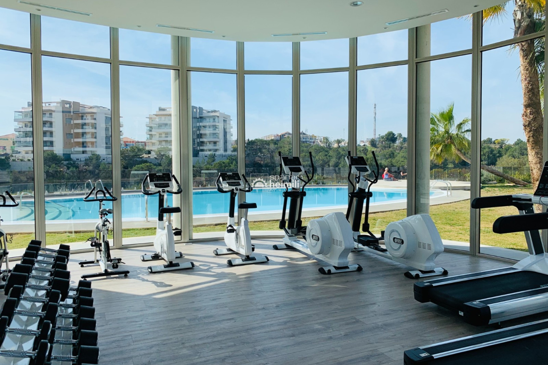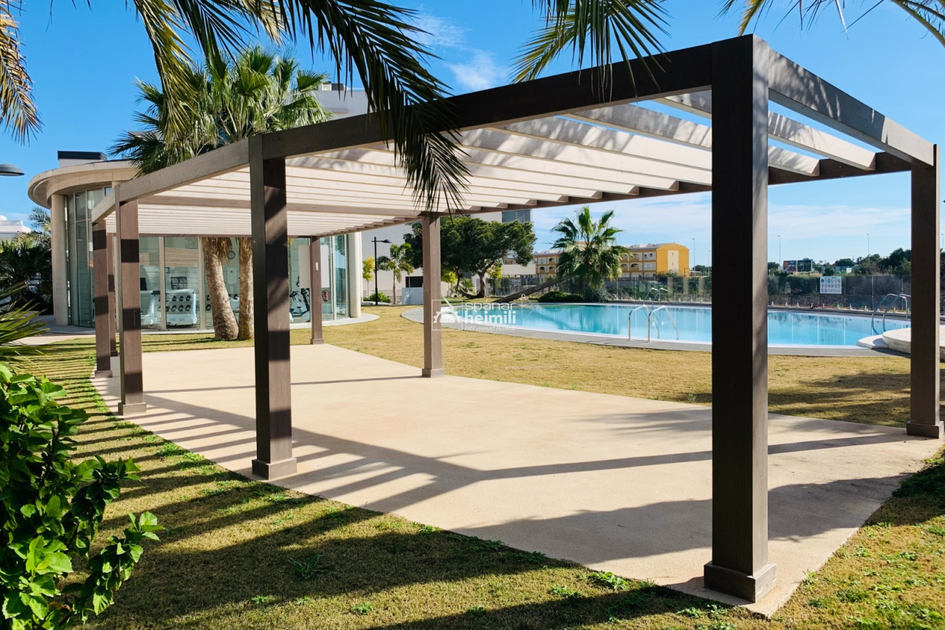 Það er fallegur sameiginlegum garði með frábærri aðstöðu, í garðinum er upphituð inni sundlaug, úti sundlaug, sauna og líkamsræktarsalur. Einnig fylgir einkabílastæði í bílastæðahúsi innan garðsins með fjarstýrðu hliði