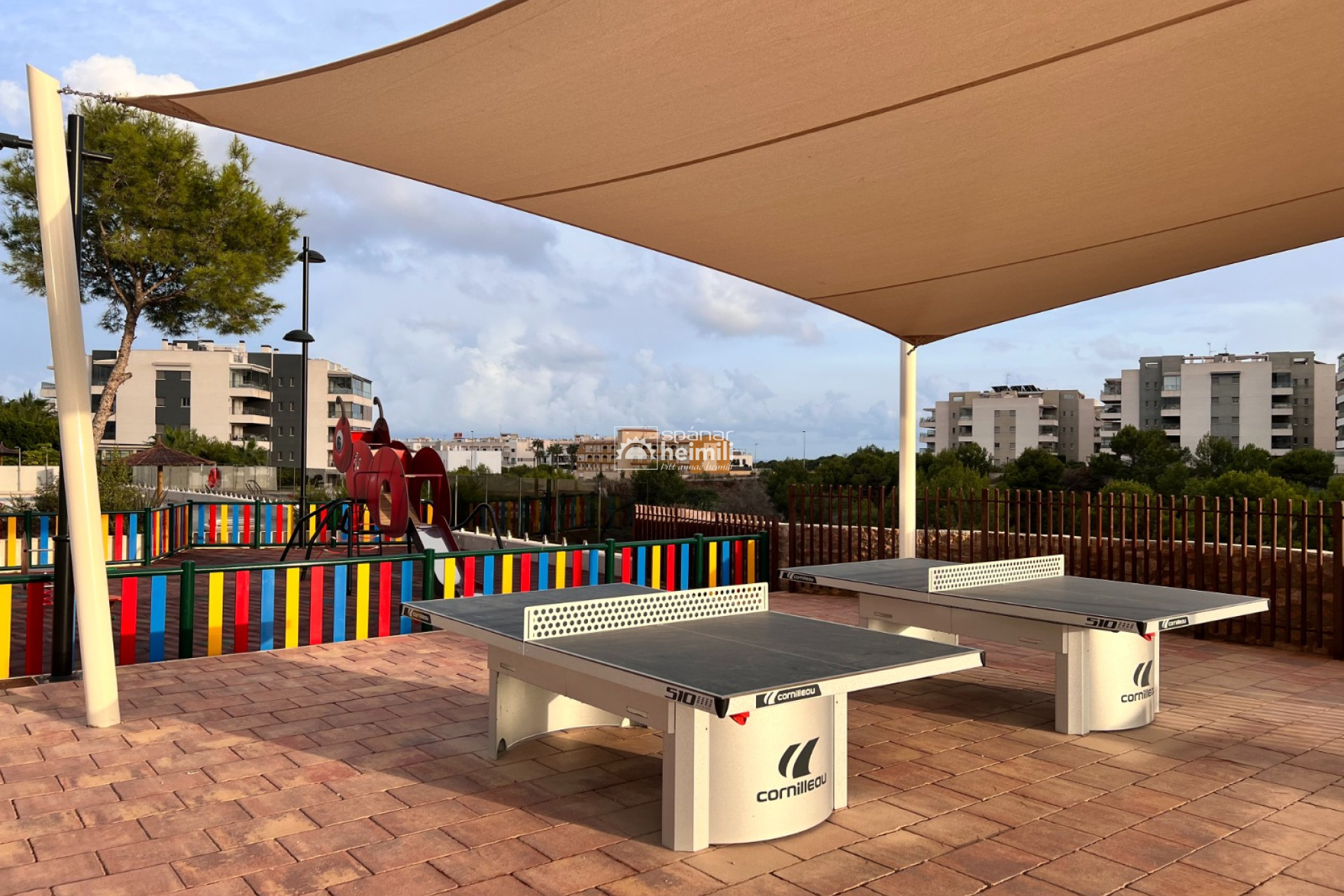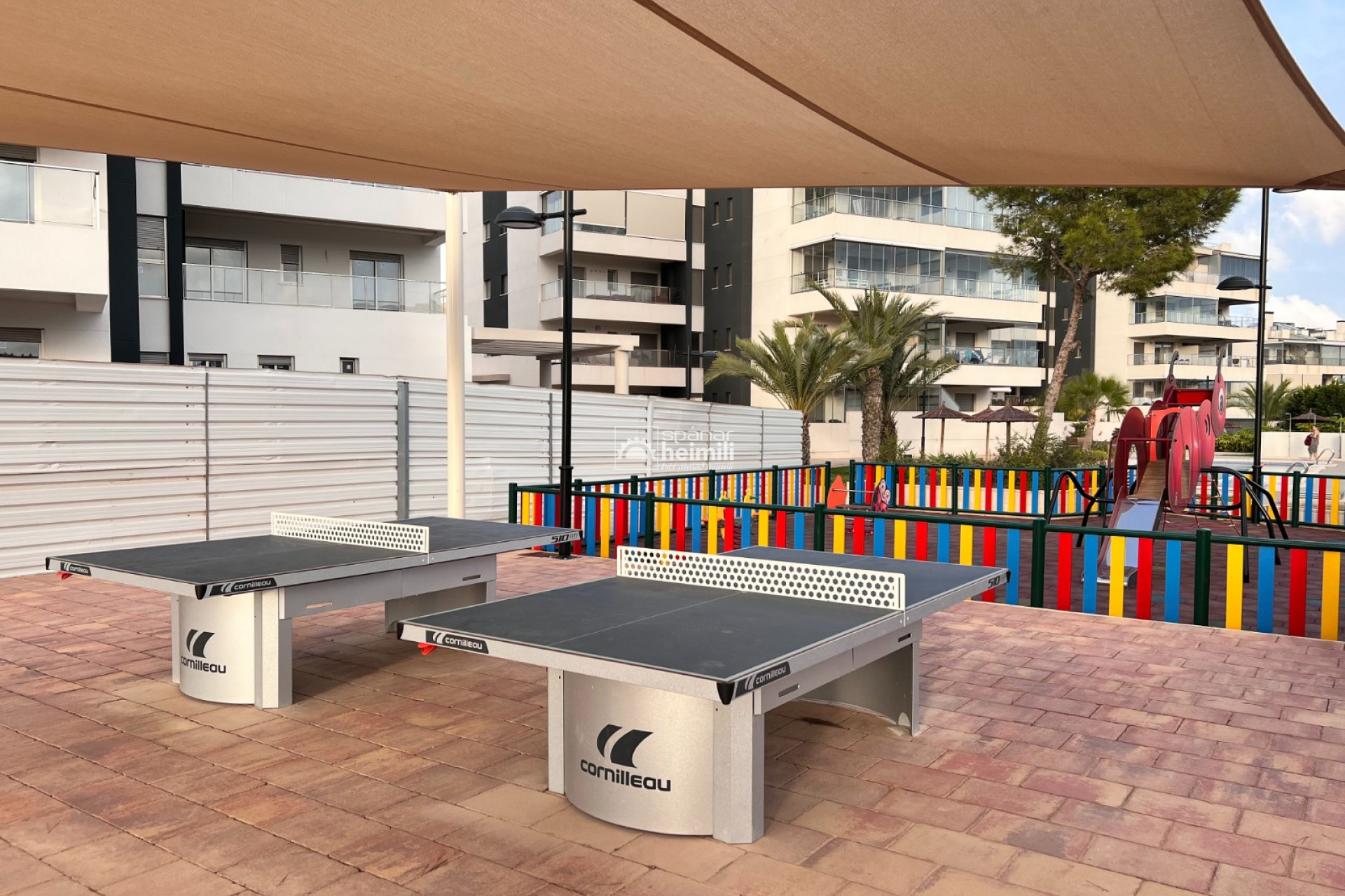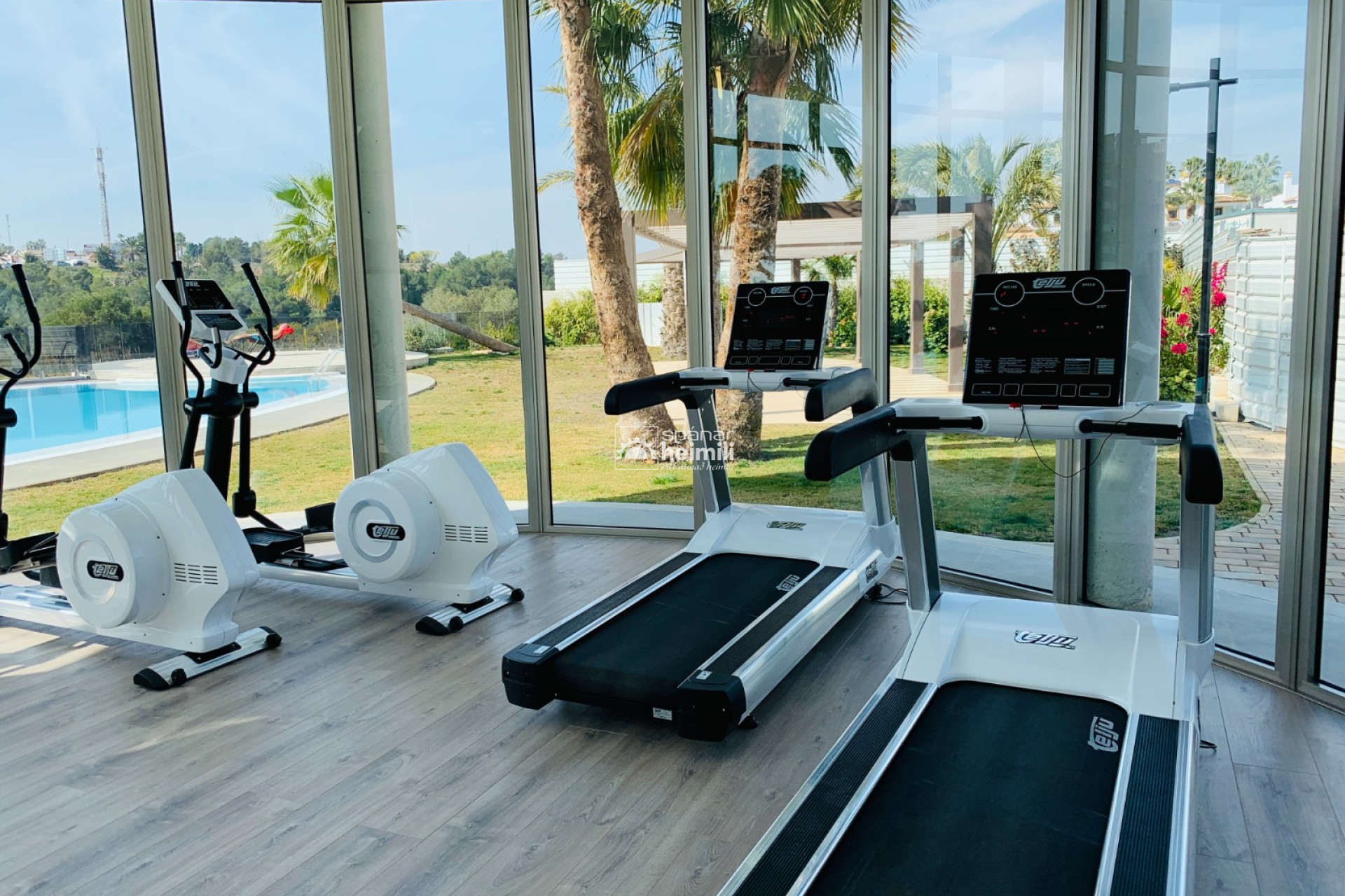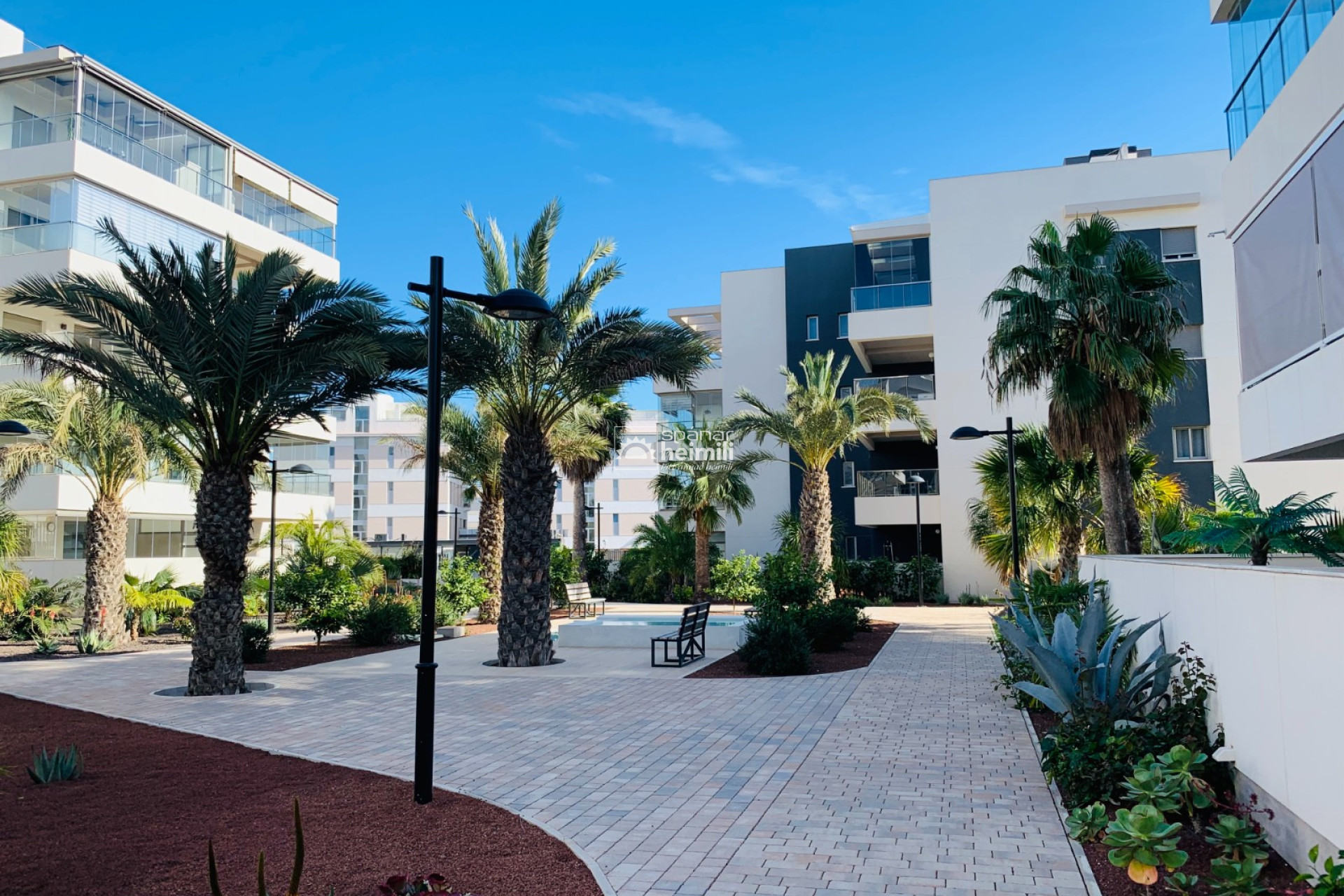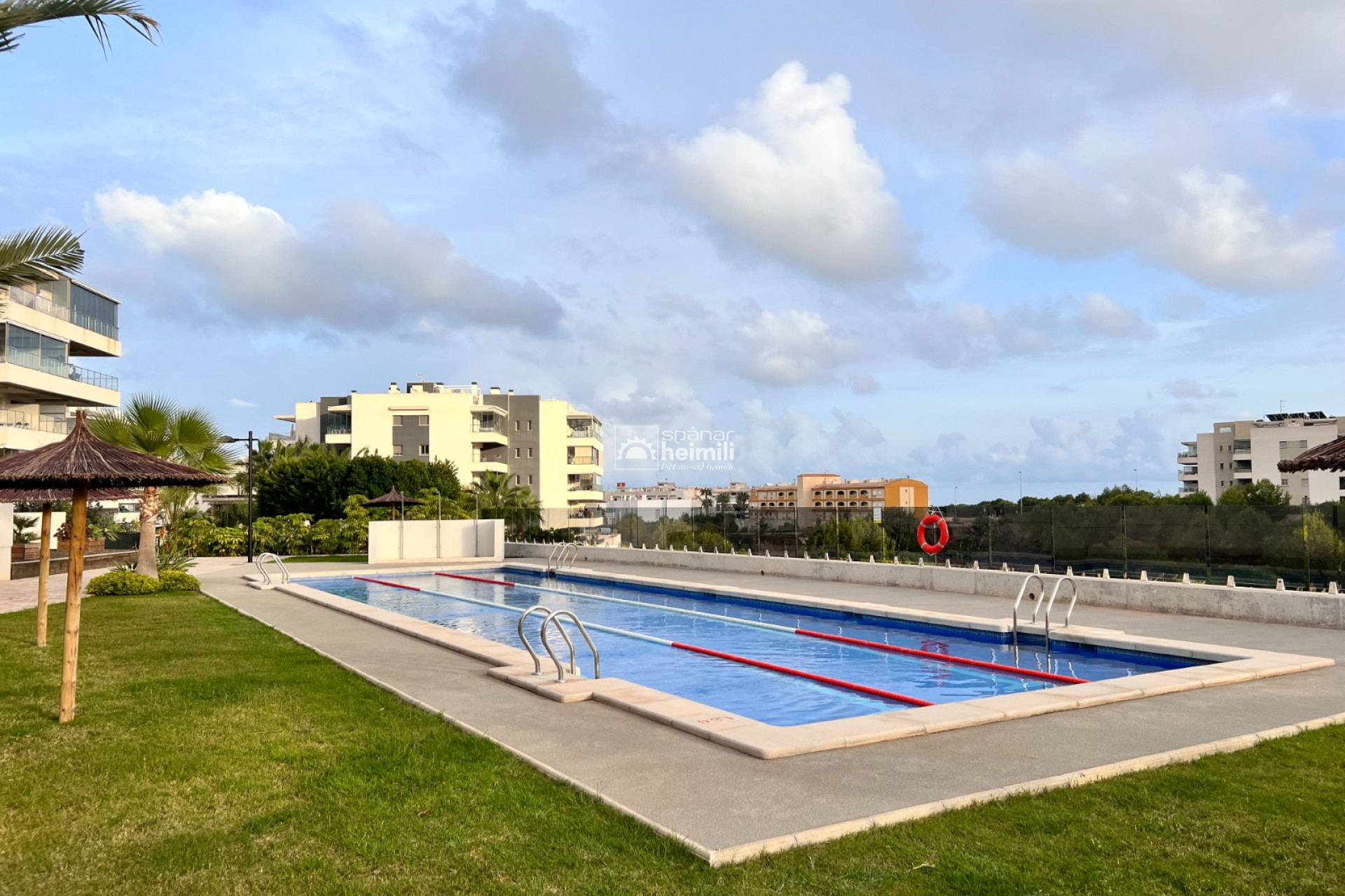 Það er fallegur sameiginlegum garði með frábærri aðstöðu, í garðinum er upphituð inni sundlaug, úti sundlaug, sauna og líkamsræktarsalur. Einnig fylgir einkabílastæði í bílastæðahúsi innan garðsins með fjarstýrðu hliði