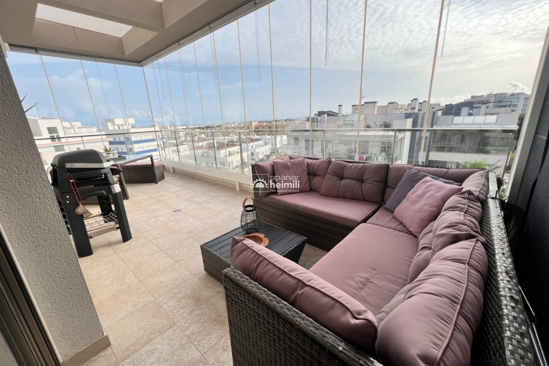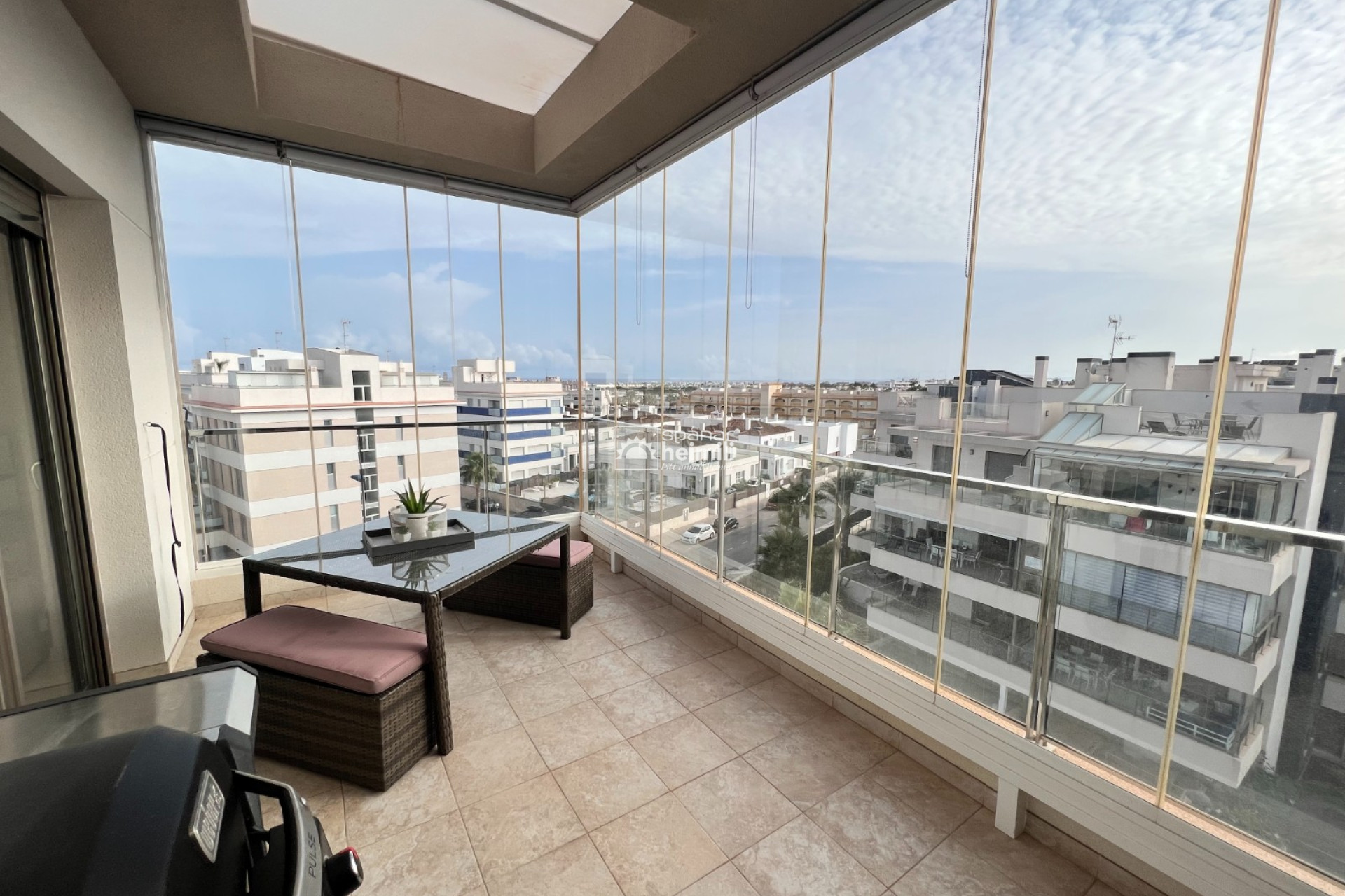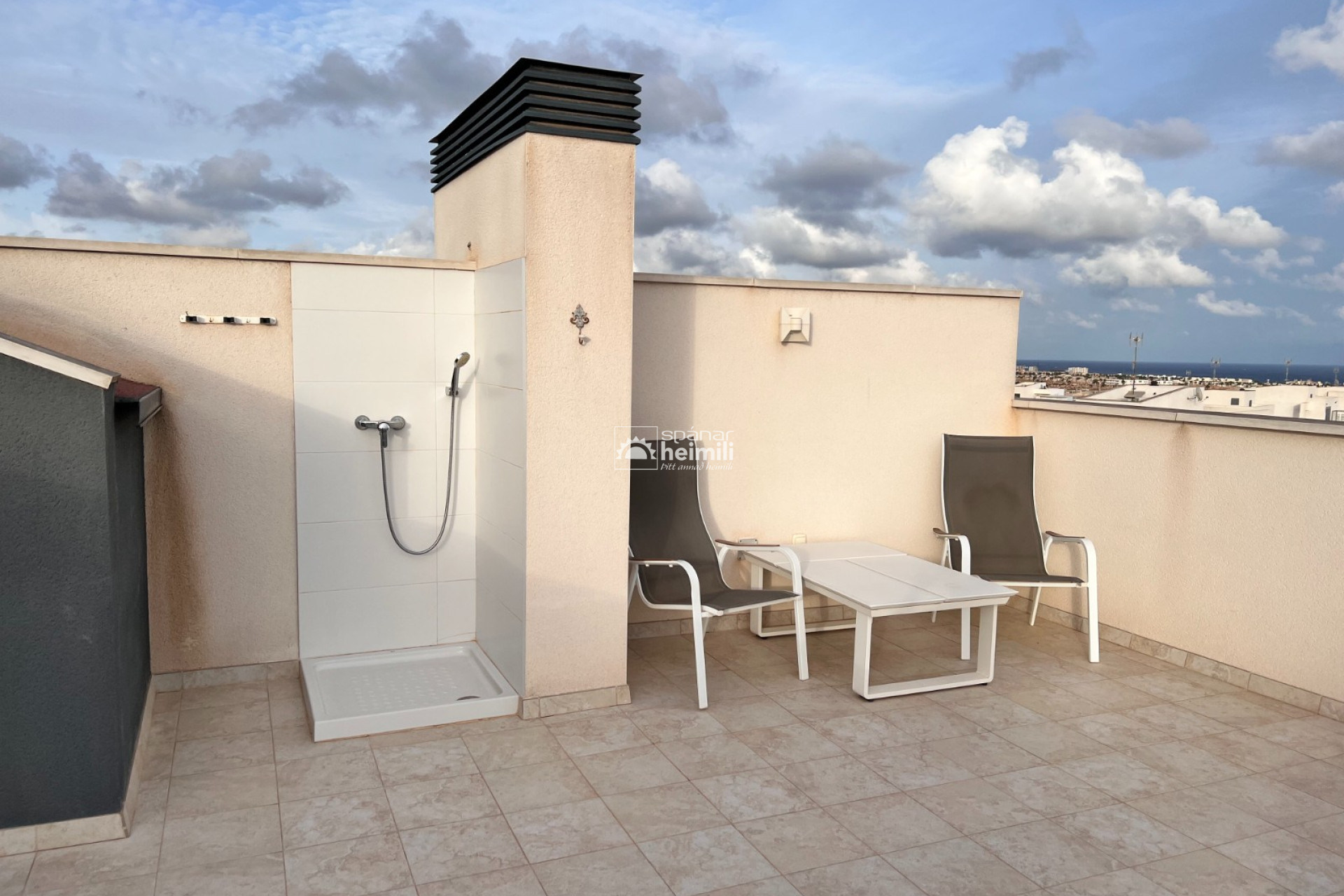 Íbúðin er á efstu hæð í Green Hills kjarnanum í Villamartin með stórum svölum sem snúa í suður sem eru lokaðar með gleri og einnig glæsilegum 45 m2 einkaþaksvölum