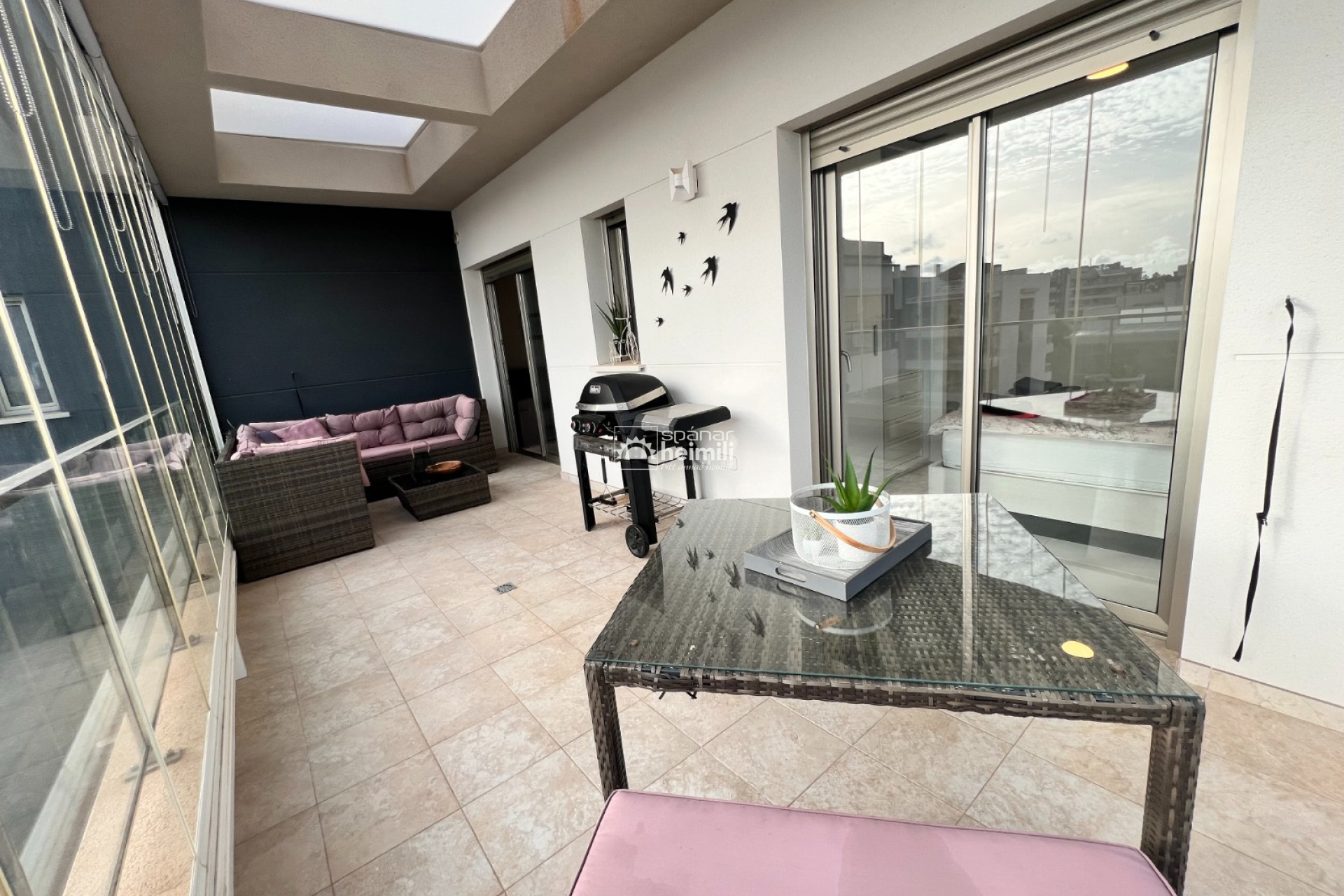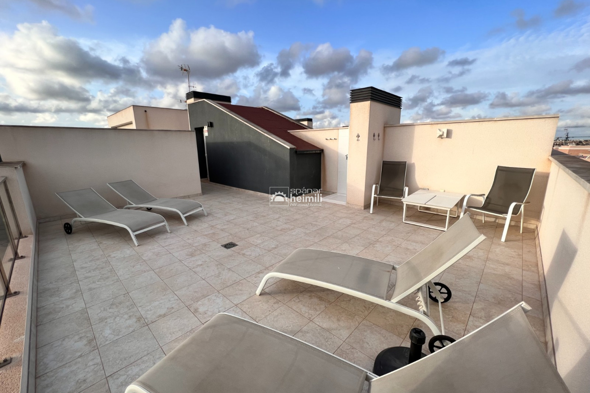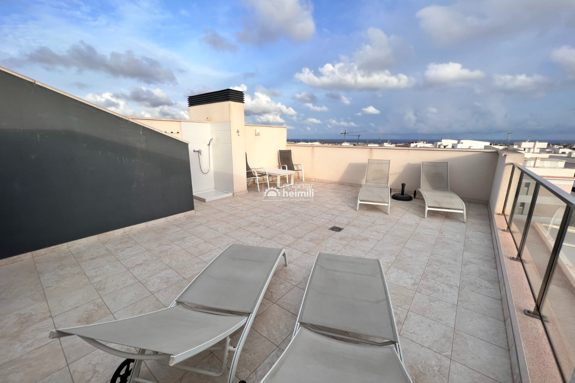 Íbúðin er á efstu hæð í Green Hills kjarnanum í Villamartin með stórum svölum sem snúa í suður sem eru lokaðar með gleri og einnig glæsilegum 45 m2 einkaþaksvölum