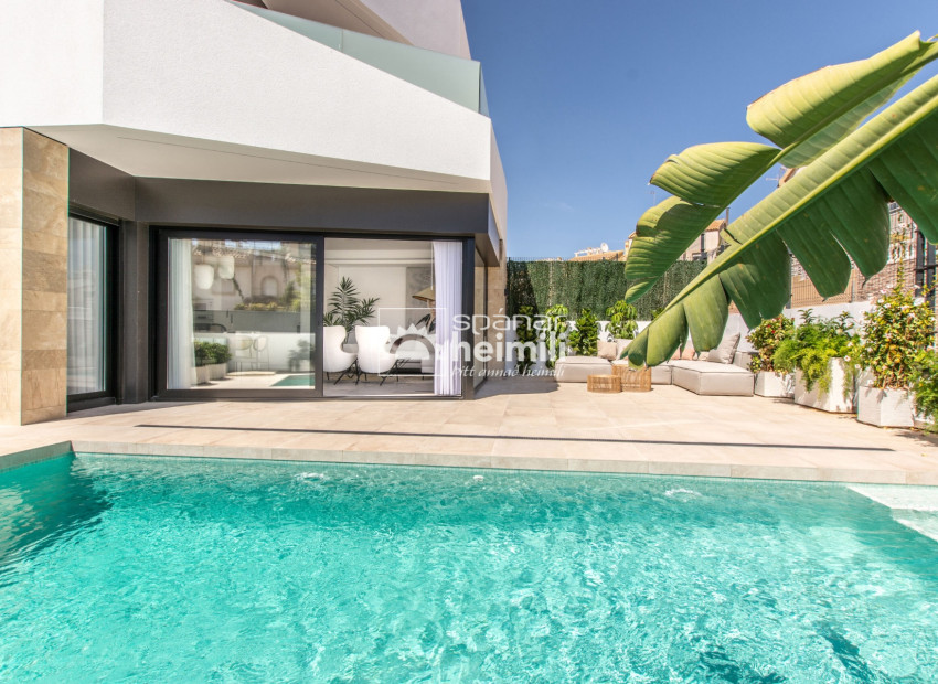 This complex has 10 villas of which only 5 are available, all with private pools, large plots, parking spaces on each plot and rooftop balconies. Each house has 3 bedrooms, 3 bathrooms and a beautiful kitchen open to the living room and dining room. On the ground floor there is the kitchen, living room, 1 bedroom and a bathroom. On the second floor there are 2 bedrooms, both with private bathrooms.